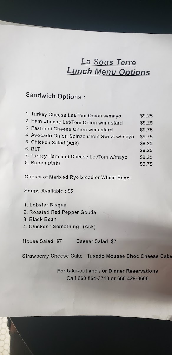 At La Sous Terre, every meal is an adventure, where each bite brings a new layer of flavor and creativity. Nestled in the heart of Warrensburg, MO, at 101 W Pine St, this menu offers a selection of dishes that feel both familiar and exciting. Whether you're in the mood for something savory, sweet, or a little of both, La Sous Terre Menu has something to satisfy every palate.
